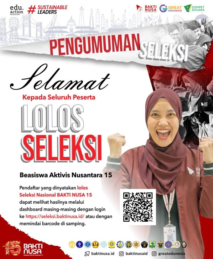 PENGUMUMAN HASIL AKHIR SELEKSI PROGRAM BAKTI NUSA ANGKATAN 15 Setelah melalui rangkaian proses seleksi yang terdiri dari Seleksi Administrasi, Seleksi Wawancara, serta Visit Leadership
